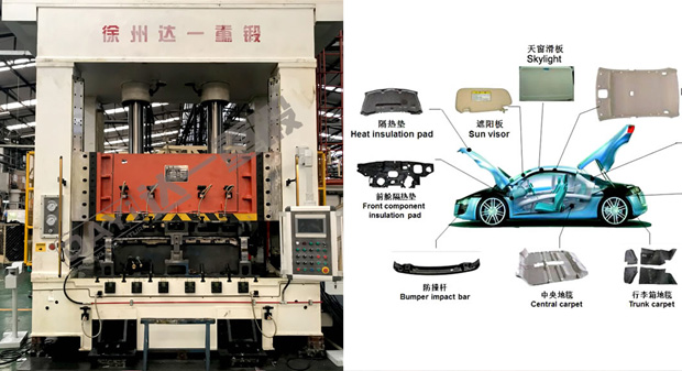 汽車內飾件成形液壓機主要應用于汽車內飾件行業的熱壓成形及切邊工藝,如頂棚、地毯、座墊、防火壁絕緣墊、側圍、行李箱地毯等。
